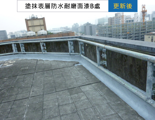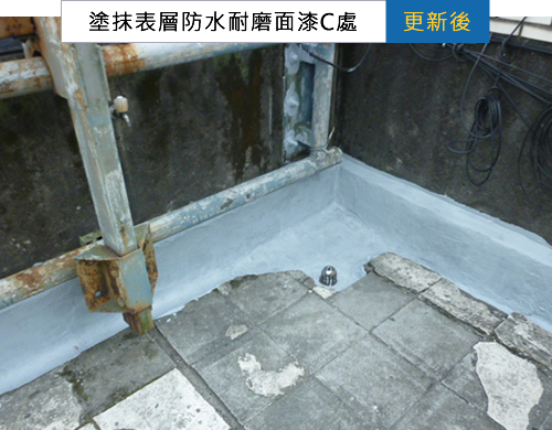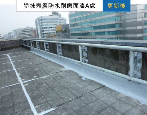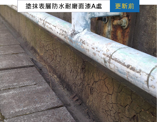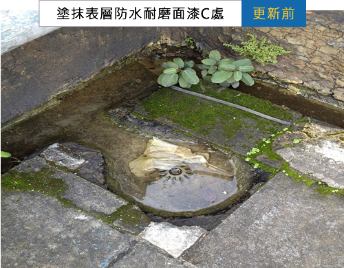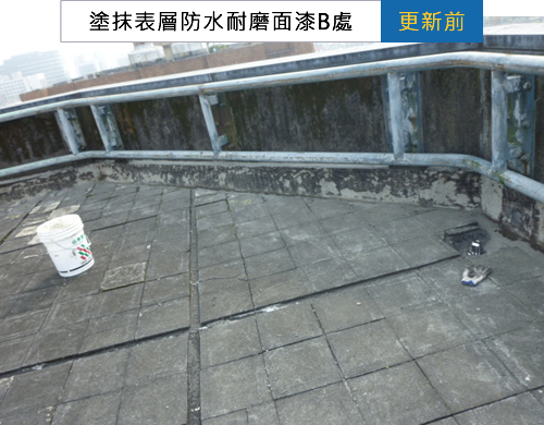 1. 打除水溝、女兒牆小平台上之瀝青防水層,原落水頭也一併拆除。